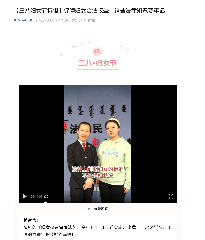 不断完善和创新普法工作,在实地走访中,部分学校和企业反映了普法覆盖面窄、灵活度不高的问题,为进一步延伸宣传覆盖面,提高普法效率,鄂托克旗检察院积极探索数字化普法,运用检察融媒体资源打造了鄂托克检察“法治教育云课堂”普法教育平台,搭建起连通“云课堂”和学校、企业多媒体平台之间的“桥梁”,集合优秀理论宣讲员、精品双语课程等优质资源,进行点对点、点对面直播普法。同时检察融媒体制作推送由本单位检察人员自编自演的原创作品《真人漫画—“双十一”消费者权益保护》《真人漫画—妇女权益保护》《普法小视频—节日防诈骗攻略》等,进一步丰富线上宣传形式,拓展受众覆盖面,提升普法质效。