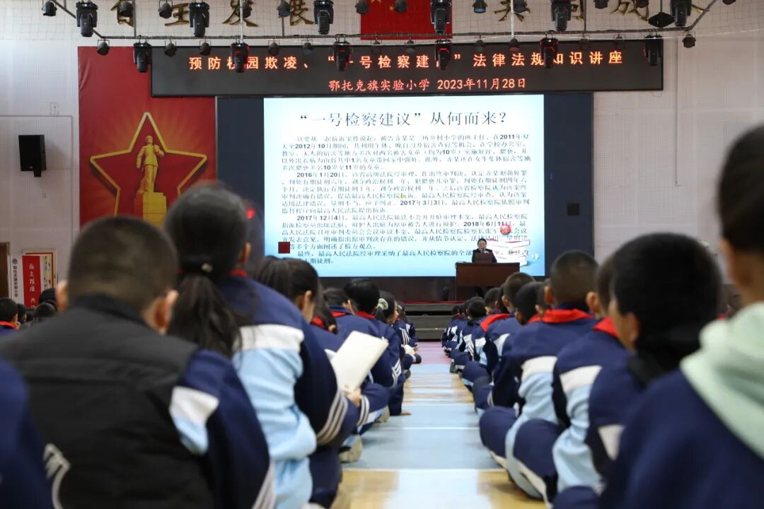 为进一步贯彻落实“一号检察建议”,加强学校法治教育,持续抓好未成年人权益保障工作,强化学生自我保护能力,鄂托克旗人民检察院检察官受鄂托克旗社会治安综合治理中心邀请为旗实验小学师生讲授了以预防性侵害、拒绝校园欺凌,远离毒品为主题的法治教育课。