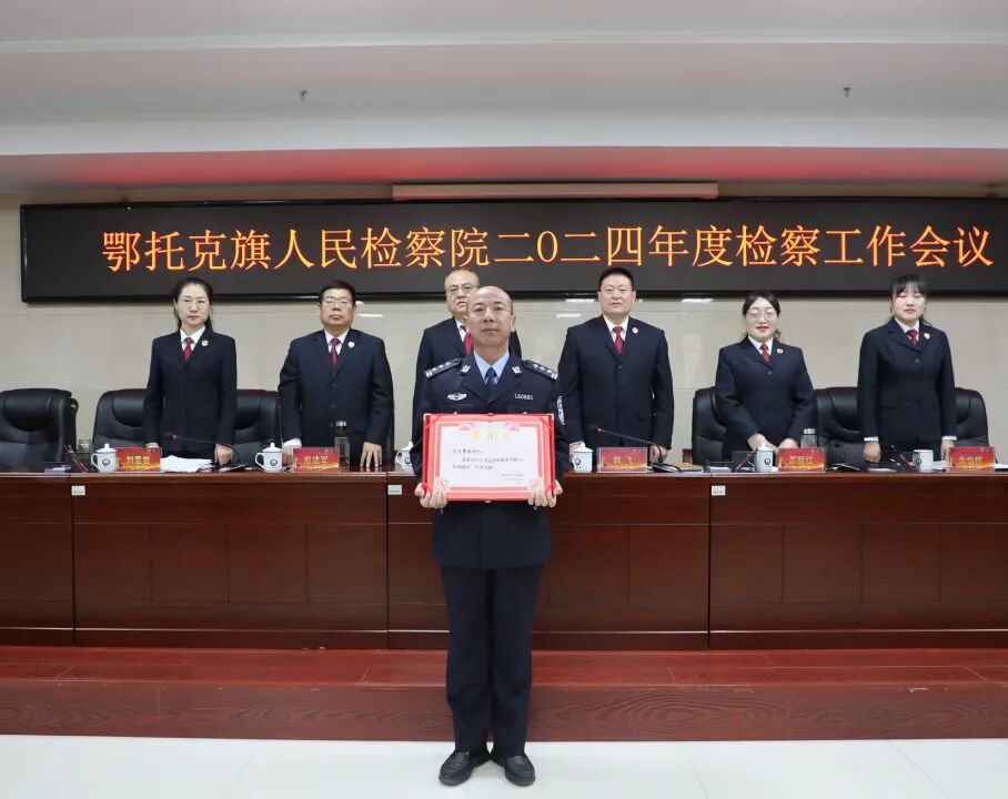 折峰检察长代表院党组向受表彰的集体和个人表示祝贺,对2023年工作进行全面总结回顾,分析当前形势与存在问题,重点对2024年检察工作作出详细安排部署,并明确指出各部门要切实提高政治站位,强化责任意识,严格贯彻落实“12345”工作思路,蓄力紧弦“争先创优”,在对标全市先进中大力推动工作、落实任务、提升数据、提高质效,奋力开创鄂托克检察工作新局面。