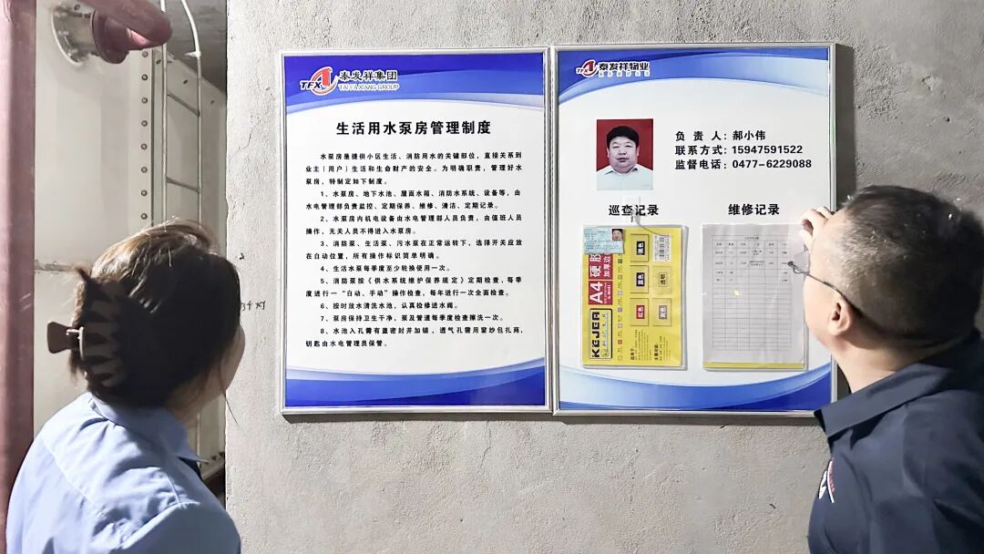 此次检查重点围绕高层小区二次供水设施的日常管理维护、水箱清洗消毒记录、设施运行状态、防护措施是否到位等进行安全检查,并详细询问物业关于水质监测频率、清洗消毒流程、从业人员健康证明等情况。